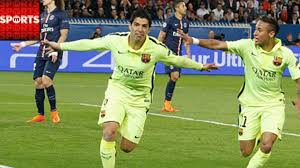 | Suarez celebrating one of his goals against PSG at Parc des Princes |